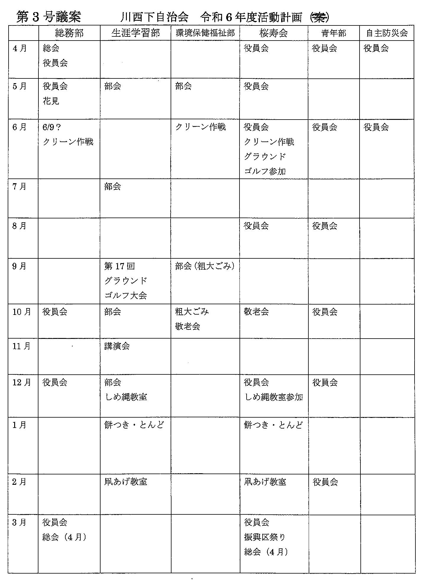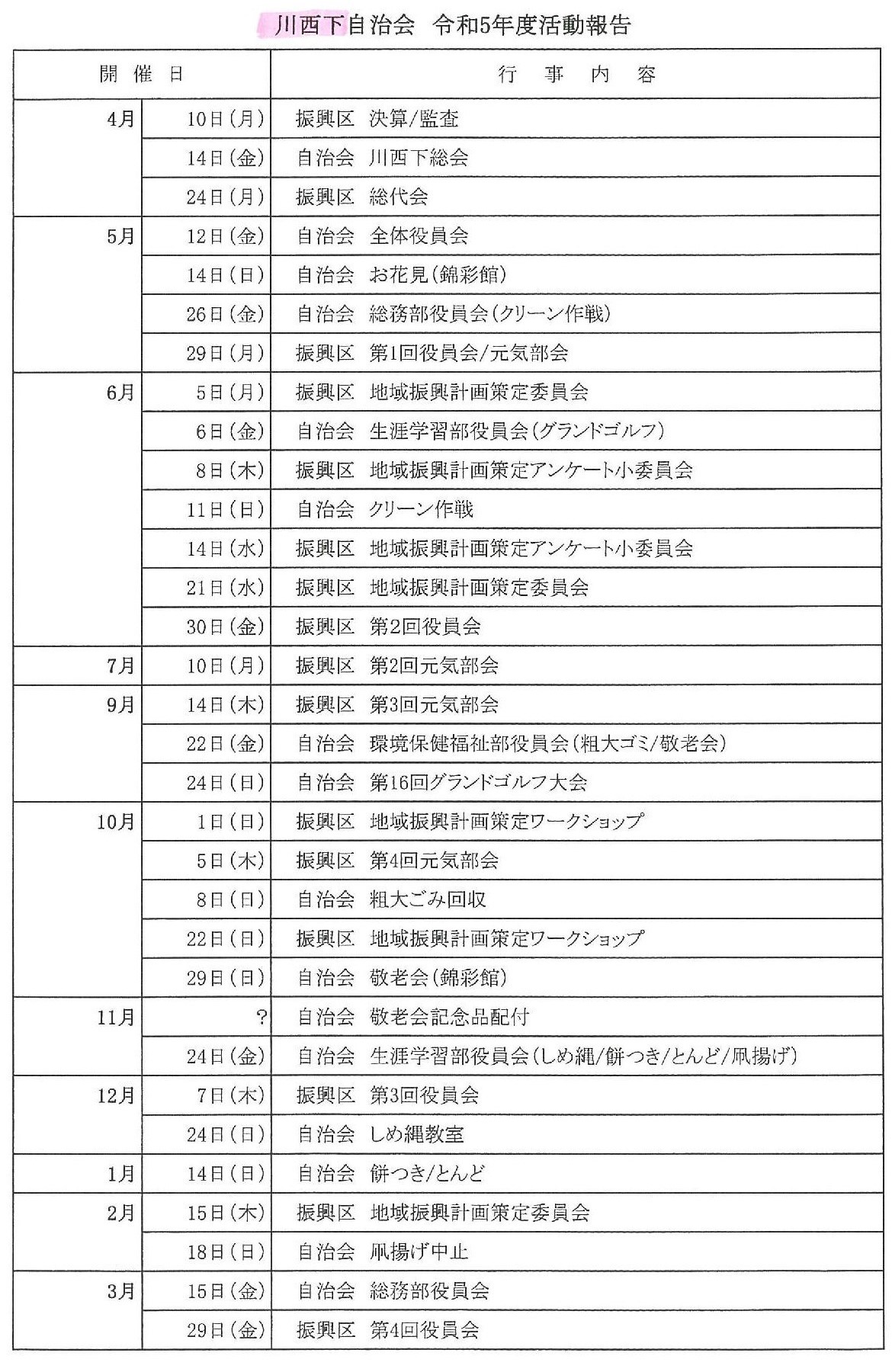 主な行事は6月のクリーン作戦、8月の親睦グラウンドゴルフ大会、9月の敬老会、11月ごろの粗大ゴミ収集、12月のしめ縄作り教室、1月の餅つき・とんど祭りです。