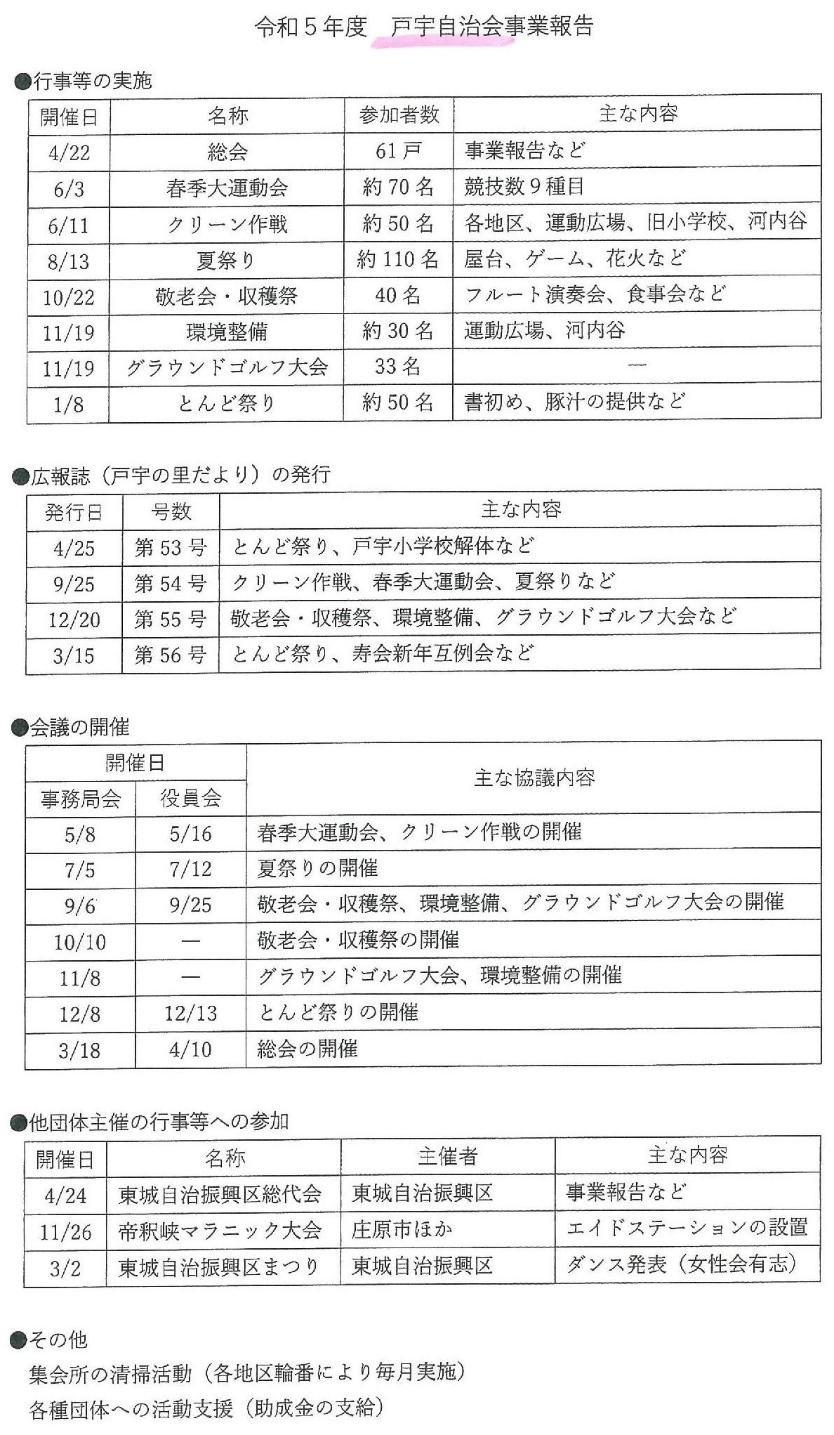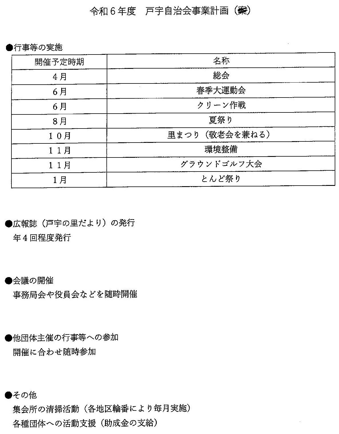年間行事として戸宇地区大運動会、クリーン作戦、戸宇夏祭り、グラウンドゴルフ、粗大ごみ回収活動、戸宇里祭り、敬老会、とんど等、8行事を予定しています。